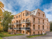 Architecturally, the materials form a symbiosis with the forest behind. The 20 residential units were built according to the KFW 40 standard and each has a balcony or terrace. The apartments of the two residential buildings can be accessed via exterior staircases and arcades.