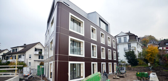 The details The load-bearing exterior walls in wood consist of adhesive-free solid wood panels 150 mm thick. These also take over the vertical load transfer from the concrete floors. The outer insulation layer consists of an insulated cross-laminated timber grid, each 120 mm thick, and is covered with a DHF board. The elements were prefabricated in such a way that they each already integrated the face formwork for the concrete slab and the support for the wall above. The facade consists of a rear-ventilated, large-format mineral panel (Rockpanel), which was subsequently installed on site.