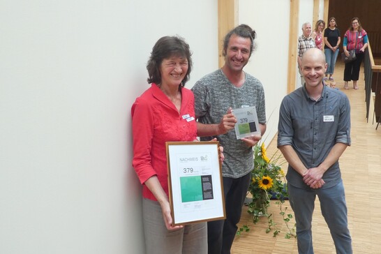 Das Generationenhaus Mooseggstrasse in Langnau ist vollendet. Joel Hächler überreichte an der Einweihungsfeier ein Zertifikat, das die Speicherung von 379 Tonnen CO₂ im verbauten Holz nachweist. Das entspricht dem CO₂-Ausstoss von 29 Erdumrundungen mit einem Mittelklasse Fahrzeug.