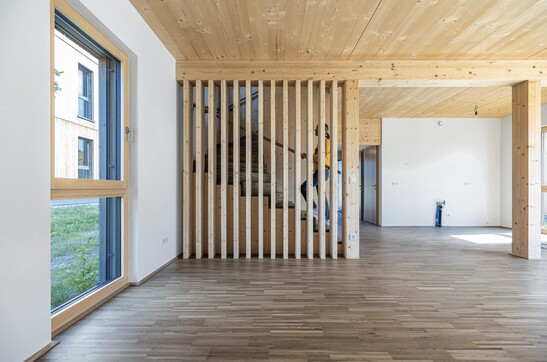 Die Wohnhäuser im Süden des Quartiers setzen voll und ganz auf umweltbewusstes Leben. Der Einsatz von Holz ist daher die logische Konsequenz. Bei den mehrgeschossigen Wohnbauten ist die Tragstruktur aus dem natürlichen Rohstoff Holz. Sichtbares Holz an den Decken sowie an einzelnen Wänden schaffen ein natürliches, beruhigtes und angenehmes Wohngefühl. Timbatec begleitete das Projekt als örtliche Bauaufsicht und steht dem Projektteam in statischen, bauphysikalischen und brandschutztechnischen Fragen zur Seite.