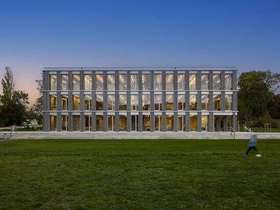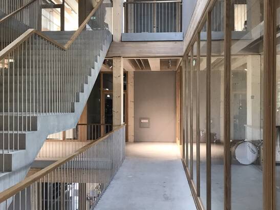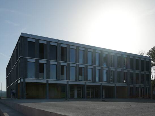 Die neue Schule kombiniert die Holzmassiv- und die Rahmenbauweise geschickt: Alle Geschossdecken und ein Teil der Innenwände für die Gebäudeaussteifung sind in Holzmassivbauweise aus Brettschichtholz erstellt. Die restlichen Innenwände sind nicht tragende Rahmenbauten. Die warmen Oberflächen von Holzwänden und -decken, sowie der ständige Austausch des Holzes mit der Luftfeuchtigkeit ergeben ein gutes Raumklima. Gut gedämmte Wände sind wichtig: Denn, je kleiner die Differenz zwischen der Oberflächentemperatur der Wände, Böden und Decken zur Lufttemperatur ist, desto behaglicher ist es in einem Raum. Darum fühlen wir uns in Holzgebäuden mit guter Wärmedämmung wohl – auch bei etwas tieferer Raumtemperatur. So können Gebäude energiesparsamer betrieben werden. Zudem hat Holz eine gefühlt höhere Oberflächentemperatur als Beton, Stahl oder Glas, was das Wohlbefinden zusätzlich steigert.