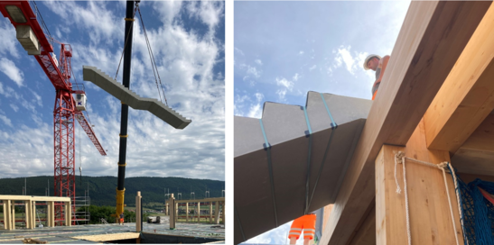 Nach der Ernte im Winter 2020/21 lieferten die Forstunternehmen das Holz an die Firma Despond SA in Bulles zur Herstellung von Lamellen, die anschliessend zu JPF-Ducret geliefert und dort verleimt wurden. Ein Teil des Holzes wurde auch zu Schilliger Holz AG für die Herstellung von Dreischichtplatten transportiert, dem einzigen Schweizer Unternehmen, das diese Art von Produkten derzeit herstellt.