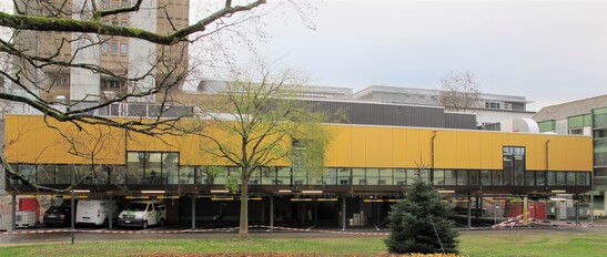 Im April starteten die Bauarbeiten. Zu diesem Zeitpunkt zweifelte manch einer, ob das neue Restaurant Ende November wirklich fertig ist. «Auch meine Architektenkollegen aus der Abteilung Architektur + Bau waren nicht so sicher, ob die Termine eingehalten werden können», erinnert sich Christoph Zehnder. Mitte Juli kamen die ersten Holzelemente auf die Baustelle. Nur drei Wochen später war der gesamte Holzbau fertig aufgerichtet. Bereits nächste Woche werden hinter der goldenen Fassade aus OSB-Platten die ersten Mittagessen serviert.