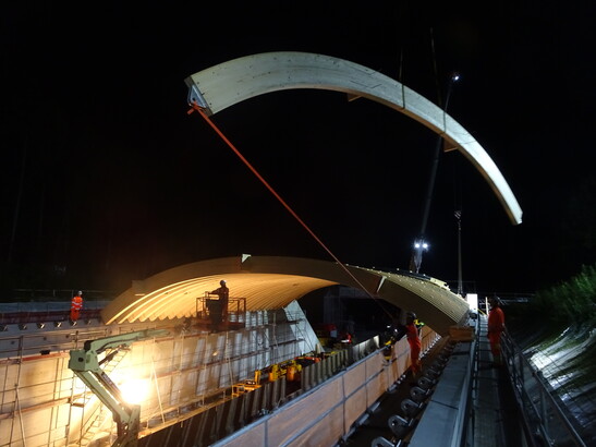 Für die Montage des Tragwerks wurde die Autobahn während 24 Nächten jeweils von 21.30 Uhr bis 4 Uhr morgens auf zwei Fahrspuren reduziert. In der Woche vom 26.10. – 30.10.2020 wurden die Abdichtungsarbeiten fertig gestellt. Bis Ende 2020 wird dann die Holzbrücke mit Wurzelschutzfolie, Sickergeröll, Drainage-Matte und Erdreich für die Bepflanzung fertig gestellt.