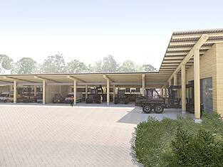 Der neue Forstwerkhof umfasst ein zweigeschossiges Betriebsgebäude in Holzbauweise und eine Einstellhalle für Maschinen, Geräte und Fahrzeuge. Über 95 % des Materials stammen aus stadteigenen Wäldern. Dabei wurde auf minimale Bearbeitung geachtet: Die Tragkonstruktion der Halle besteht aus Rundholz, das direkt aus dem Wald eingebaut wurde. Das übrige Fichten- und Tannenholz wurde in einer nahegelegenen Sägerei sowie bei regionalen Verarbeitern zu Brettern, Balken und Leimholz verarbeitet und kehrt schrittweise auf die Baustelle zurück. Kurze Transportwege machen den Neubau besonders energieeffizient und CO₂-speichernd; die Beheizung erfolgt mit stadteigenem Stückholz.