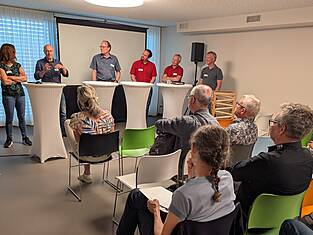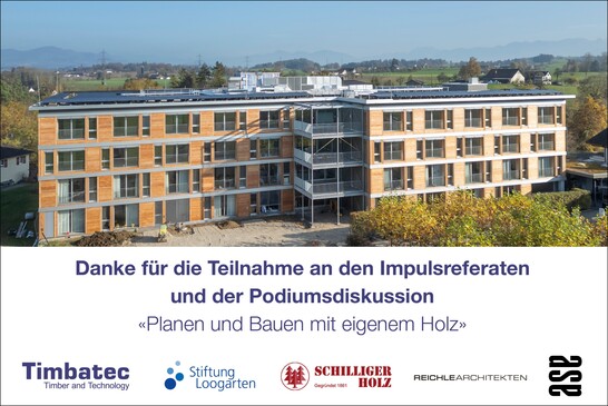 «Wer mit eigenem Holz baut, erhält ein Gebäude mit Mehrwert und schafft sich gleichzeitig den emotionalen Bezug zum eigenen Rohstoff». Zum Fokusthema «Planen und Bauen mit eigenem Holz» fanden im 2-geschossig neu aufgestockten «Esslinger Loogarten» Impulsreferate sowie eine Podiumsdiskussion statt.