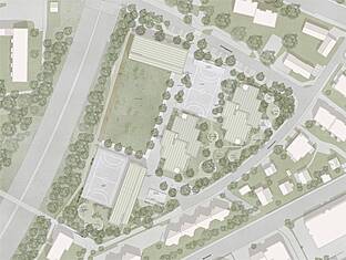 Das Projekt MOSAIK zeichnet sich durch eine gute Integration ins Quartier aus. Bestehende Gebäudeeinheiten werden mit Holzmodulen erweitert. Zusätzlich gibt es zwei neue Gebäude: den Gemeinschaftstrakt an der Schöneggstrasse und das Sportgebäude im südlichen Teil der dreieckförmigen Parzelle. Das Projekt überzeugt finanziell und ökologisch, da es den Bestand ressourcenschonend integriert und zusätzliches Raumprogramm ökologisch mit Holz ergänzt. Trotz geringeren Geschossflächen überzeugt das Raumprogramm aus organisatorischer und betrieblicher Sicht. Wie ein MOSAIK sind sowohl die Baukörper mit den dazwischenliegenden Aussenräumen auf dem Schulareal als auch die zueinander versetzten Klassenräume in den Klassentrakten angeordnet.