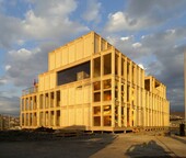 Die Ingenieure von Timbatec waren gefordert, ein robustes, zerlegbares, wirtschaftliches Holzbausystem zu entwickeln, das in jeder Situation stabil, sicher und regendicht war. Gelöst wurde die Aufgabe mittels einer Rippenkonstruktion, die sich sowohl in den Wänden wie auch bei den Geschossdecken und im Dach wiederholt.