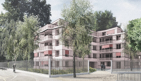 deDeutschDer neue Baukörper für die Alterswohnungen wird als solitäre Doppelvilla im Park verstanden, die von der Baumpflanzung umspühlt wird. Die gestaffelte Figur nimmt Rücksicht auf den Baumbestand und lässt den grossen Parkbäumen ausreichend Platz. Der Versatz des Volumens verzahnt die ortsbaulichen Achsen der Nachbarsbauten - Wohnbau im Norden, Altersheim im Süden – und reiht sich in in seiner Grösse in die Bahngeleise begleitende Bebauung ein. Sechs Wohnungen formen als Verteil- und Begegnungsraum eine zentrale Mitte als Herzstück des Hauses: man trifft sich, hier sind geschossweise Waschräume, ein Gästezimmer, eine Gemeinschaftsküche, und zumietbare Flexräume angegliedert. Der Grundtyp der Wohnungen basiert auf einer 3.5 Zimmer Wohnung. Die Wohnung verfügt über keine Erschliessungsflächen.