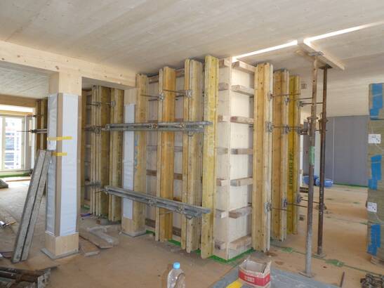 Die 42 Millimeter dicken 3-Schichtplatten wurden für den Brandschutz auf der Rauminnenseite mit 3x15 Millimeter Gipsfaserplatten verkleidet. Auf der anderen Seite dient die Platte als verlorene Schalung für den Beton. Bis der Beton ausgehärtet ist, wird das Treppenhaus provisorisch verstärkt.