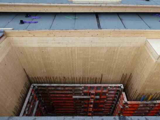 Die Vorteile der neuen Vorgehensweise liegen auf der Hand: Es braucht deutlich weniger Stahlprofile und Schrauben, die Verbindung vom Holzbau zum Betonkern ist einfacher und die Bauzeit kürzer. Der Auf- und Abbau des Gerüstes und der Schalung für den Betonkern entfällt und die Menge des eingesetzten Betons kann reduziert werden. Dies bei gleicher Leistung: Der nachträglich eingegossene Beton ist form- und kraftschlüssig mit dem Holzbau verbunden. Die Treppenhauskerne dienen der statischen Aussteifung der Gebäude und stellen die Fluchtwege im Brandfall sicher.