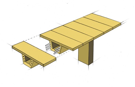 Le banc d'essai longue durée TS3 de la Haute école spécialisée bernoise a fourni des résultats importants pour le développement réussi de la technologie TS3 et a aidé cette technologie à percer sur le marché. Il est désormais démantelé. Dans l'esprit de l'économie circulaire, les panneaux en bois contreplaqué donnent naissance à un nouvel objet : deux éléments à caisson creux pour des ponts pour charges lourdes.