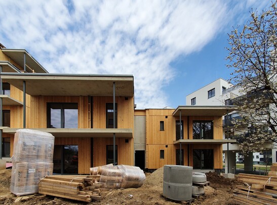 Les habitations situées au sud du quartier misent entièrement sur une vie respectueuse de l'environnement. L'utilisation du bois est donc logique. en est la conséquence logique. Pour les immeubles d'habitation à plusieurs étages, la structure porteuse est en bois, une matière première naturelle. Le bois apparent au plafond et sur certains murs crée une atmosphère naturelle, apaisante et agréable. sentiment de bien-être. Timbatec accompagne le projet en tant que superviseur local de la construction et se tient à la disposition de l'entreprise. l'équipe de projet pour les questions de statique, de physique du bâtiment et de protection contre l'incendie. questions de sécurité.