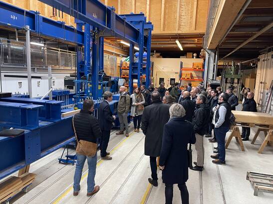 Le programme était placé sous le signe de la motion lancée en 2021 «Recherche et innovation du matériau bois pour l'utilisation dans la construction d'infrastructures en tant que contribution à la décarbonisation». Dans le cadre de la visite, les collaborateurs de l'OIC et de l'Office des ponts et chaussées ont eu un aperçu des compétences de la Haute école spécialisée bernoise en matière de recherche sur le bois et du grand potentiel de la motion pour la neutralité climatique de la Suisse.