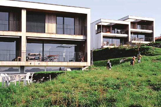 Les murs ont été construits en ossature bois, les plafonds en panneaux nervurés. Le parement inférieur, un panneau Livingboard, a également servi de plafond fini. Sur la face supérieure, le parquet massif en lames Douglas a été directement appliqué. Un coffrage Douglas non traité et ventilé par l'arrière a servi de coffrage extérieur. La cloison de séparation du bâtiment a été réalisée sous la forme d'une cloison à ossature bois double, revêtue des deux côtés, et recouverte sur la face extérieure de 2 plaques de plâtre armé de fibres de 15 mm.