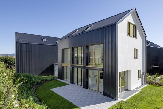 Les maisons individuelles ont également une structure de toit en bois et ont également été construites en tant que construction massive avec des éléments de façade non porteurs en ossature bois. Tous les raccords spéciaux et les étanchéités nécessaires ont été planifiés par Timbatec. Pour ces maisons, la planification de la façade et l'étanchéité de l'enveloppe du bâtiment étaient au premier plan. Une façade en tôle ventilée a été prévue sur les éléments en bois non porteurs, qui devait se fondre dans le revêtement du toit en pente sans transition visible. Pour ce faire, les mêmes tôles que celles utilisées pour la façade ont été utilisées comme revêtement de toit.