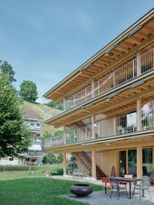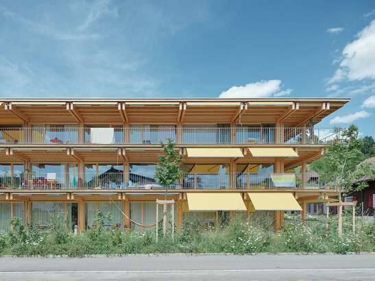 Le maître d'ouvrage accorde une grande importance à la régionalité et au choix écologique des matériaux. Il est donc logique que les matériaux nocifs pour le climat tels que le béton et l'acier soient réduits au minimum dans la maison intergénérationnelle. Au total, 585 m3 de bois ont été utilisés dans le bâtiment. Cela correspond à un cube en bois massif de 8,4 m de côté. À titre de comparaison, la maison de trois étages a une hauteur de 8,6 mètres. En Suisse, une telle quantité de bois repousse en environ 90 minutes. En grandissant, ce bois stocke, grâce à la photosynthèse, 379 tonnes de CO2 qui est désormais stocké à long terme dans la maison intergénérationnelle.