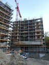 Les quatre bâtiments ont été construits selon une méthode hybride. Le noyau de la cage d'escalier, les piliers intérieurs et les plafonds sont en béton armé. Les murs extérieurs sont en bois. Les poteaux porteurs sont intégrés dans les murs de construction cadre et sont déplacés en tant qu'éléments. Les grands avantages sont que les éléments forment le coffrage frontal et permettent un redressement rapide et simultané de la construction en bois et de la construction massive.