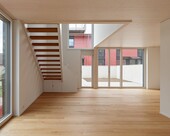 Nous nous sommes occupés de ce lotissement à Rain. Le garage souterrain existant a été suffisamment renforcé pour que les bâtiments de deux étages puissent être construits au-dessus. Au-dessus du sol, tout a été construit en bois avec des plafonds en bois visibles. Il a fallu tenir compte de la physique du bâtiment en raison de la présence d'une route principale très fréquentée.