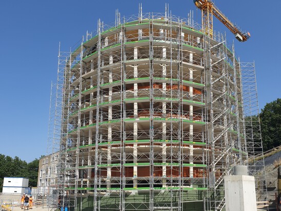 La structure en poteau-poutre en forme de couronne est faite d'elements bois lamellé-collé en hêtre. Les vingt-cinq rayons que forment les poutres des dalles bois-béton reposent au centre contre le noyau en béton et en façade sur des poteaux en hêtre. Le toit repose sur des poutres moisées s'insérant au centre dans un anneau en bois lamellé-collé, la façade extérieure est légèrement décalée offrant ainsi de généreuse terrasse.