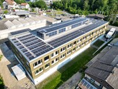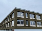 Un constructeur bois situé à proximité a préfabriqué avec précision les éléments de façade en ossature bois. Une grue mobile a soulevé les éléments de mur extérieur entre l'échafaudage de façade et la structure du bâtiment. Ceux-ci ont été fixés au gros œuvre. Le mode de construction choisi a permis une fermeture rapide de l'enveloppe du bâtiment et donc un début précoce des travaux d'aménagement intérieur. La dernière étape de montage a été la pose du revêtement de façade.