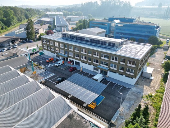 Le centre commercial Leimere Park a été conçu comme un bâtiment multifonctionnel répondant à différents besoins et offrant de multiples avantages aux locataires. L'ensemble du rez-de-chaussée est conçu comme un magasin de vente. Les étages supérieurs abritent des surfaces commerciales pouvant être divisées de manière flexible et permettant différentes utilisations. La vaste installation photovoltaïque sur les toits produit l'électricité pour l'immeuble ainsi que pour les stations de recharge électrique qui servent aux voitures et aux vélos. Le bâtiment est réalisé sous forme de construction hybride. La structure porteuse en construction massive a été réalisée en amont et habillée d'éléments de murs extérieurs en ossature bois.