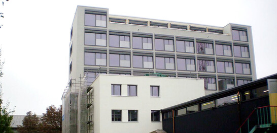 Une extension en forme de L de 4 étages a été réalisée au-dessus du bâtiment commercial existant de 3 étages. Mode de construction : Ossature en acier et béton avec des éléments de façade non porteurs en bois.