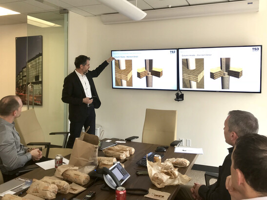 An important contact in the USA for the TS3 representatives is engineer Dean Lewis of DCI Engineers in San Francisco. Herzog and Zöllig have known the American since their visit to last year's conference in Portland. conference in Portland and were able to convince him of the TS3 technology. technology. For Lewis, it is clear that this technology will open up entirely new possibilities for timber construction.