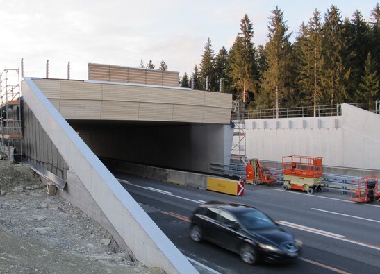 At Neuenkirch, a wildlife overpass is being built over the A2. The work for Switzerland's second wildlife overpass with a wooden superstructure has been underway since summer 2020. In the meantime, the central support and the concrete abutment walls have been built. concrete abutment walls have been built. The first carriageway is already completely covered.