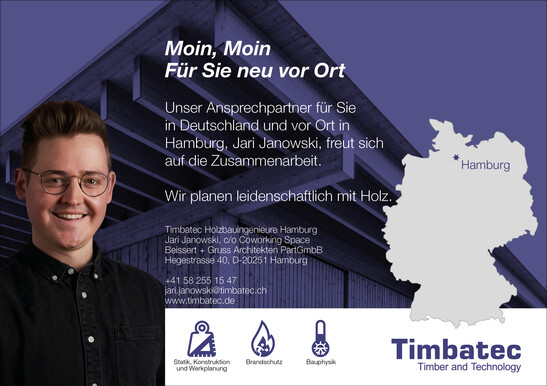 We are therefore all the more pleased that Jari Janowski has been on site in Hamburg as Head of Timbatec Germany since 01.09.2025. He combines the best of both worlds: Swiss timber construction knowledge and a deep understanding of the requirements of timber construction in Germany.