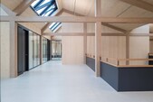 The columns and beams in beech (grid 4.0 x 5.0 m) with spruce solid wood floors above allow for an economical and efficient construction method. The supporting structure also immediately forms the visible surfaces inside the building and gives the building its own character. The three-meter cantilevered canopy was created using a TS3 CLT panel (wooden panel supporting in both directions) and suspended from the building with tie rods. The same type of construction (TS3) was also used to create the roof for the container spaces, which is supported at certain points.