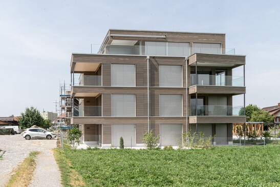 The new building on Dorfstrasse in Uetendorf comprises two structures, each with three full storeys and an attic storey. Both buildings are connected via a shared basement with a parking garage for over 20 cars, a spacious bicycle room and basement and utility rooms. The upper floors contain 18 apartments, all with attractive south-facing and partly west-facing outdoor spaces. The two buildings were constructed above ground in timber, while the basement and stairwells are made of reinforced concrete.