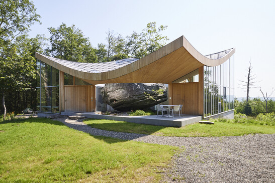 Seven years ago, Wassmann and his wife began looking for land in upstate New York on which to build a home for themselves and their two children, Kiki and Lorenzo. When they were alerted to a lot for sale in a former quarry, the story began with the new wood-frame building in a class of its own. An impressive rock is the central element of the new family home. For Wassmann, the connection between people and nature is central, so the rock is not a nuisance. On the contrary: it is to become part of the new building.