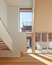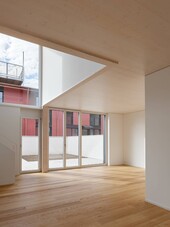 We supervised this development in Rain. The existing underground parking garage was upgraded so that the two-storey buildings could be constructed above it. Above ground, everything was built in timber with visible wooden ceilings. A busy main road had to be taken into account in terms of building physics.