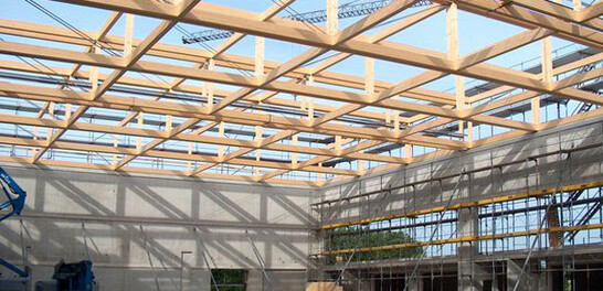 The main supporting elements of the roof are formed by trusses arranged in pairs at 5.40 m grid. The top chord (18 / 36 cm), bottom chord (18 / 36 cm) and posts (18 / 18 cm) are made of glulam, while the struts are steel tension struts.